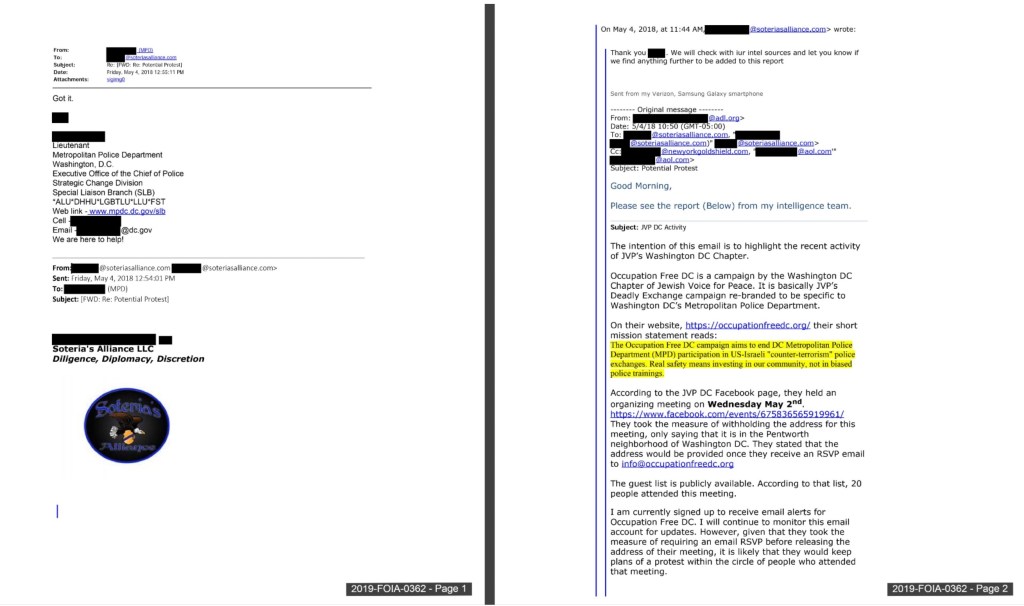 2020 – After more than 100 racial and economic justice organizations issue an open letter to progressives to #DropTheADL, the ADL claims “The idea that we surveil progressive movements or target them is patently false.” Two days later, a FOIA request reveals that the ADL hired a private investigative firm to track and surveil Occupation-Free DC and Jewish Voice for Peace’s Washington DC chapter — which organize to end DC police participation in U.S.-Israel police training exchanges — and passed reporting from the ADL’s “intelligence team” to a private conduit to the Washington Metropolitan Police Department.